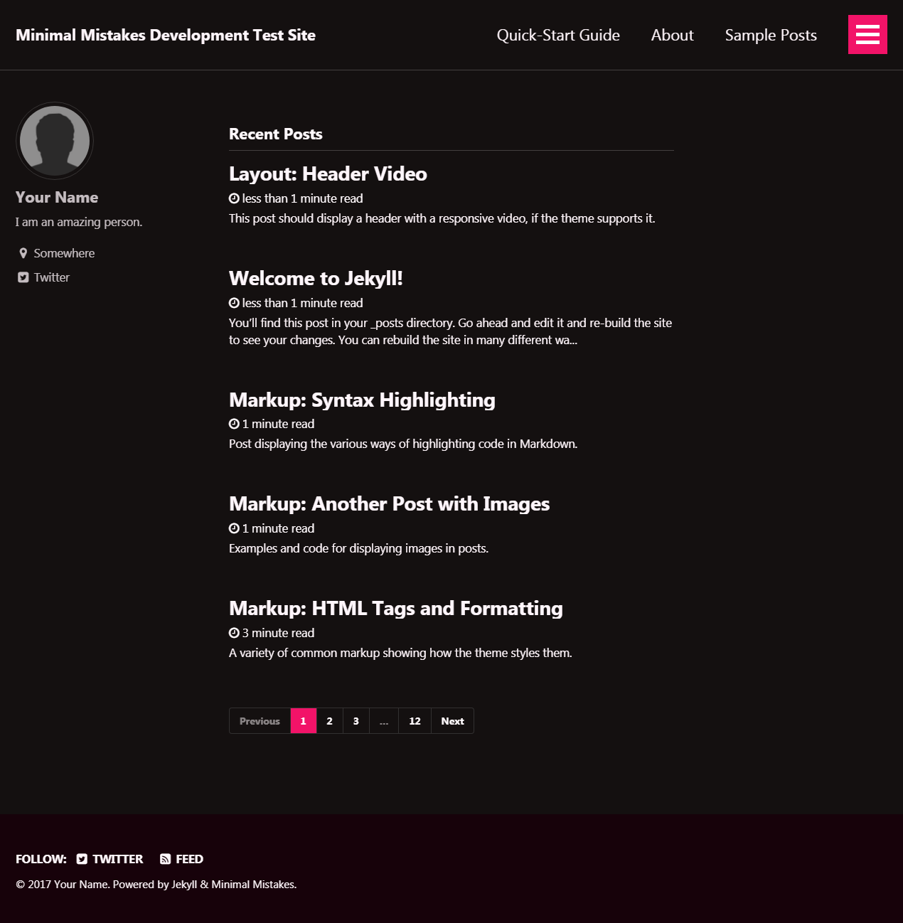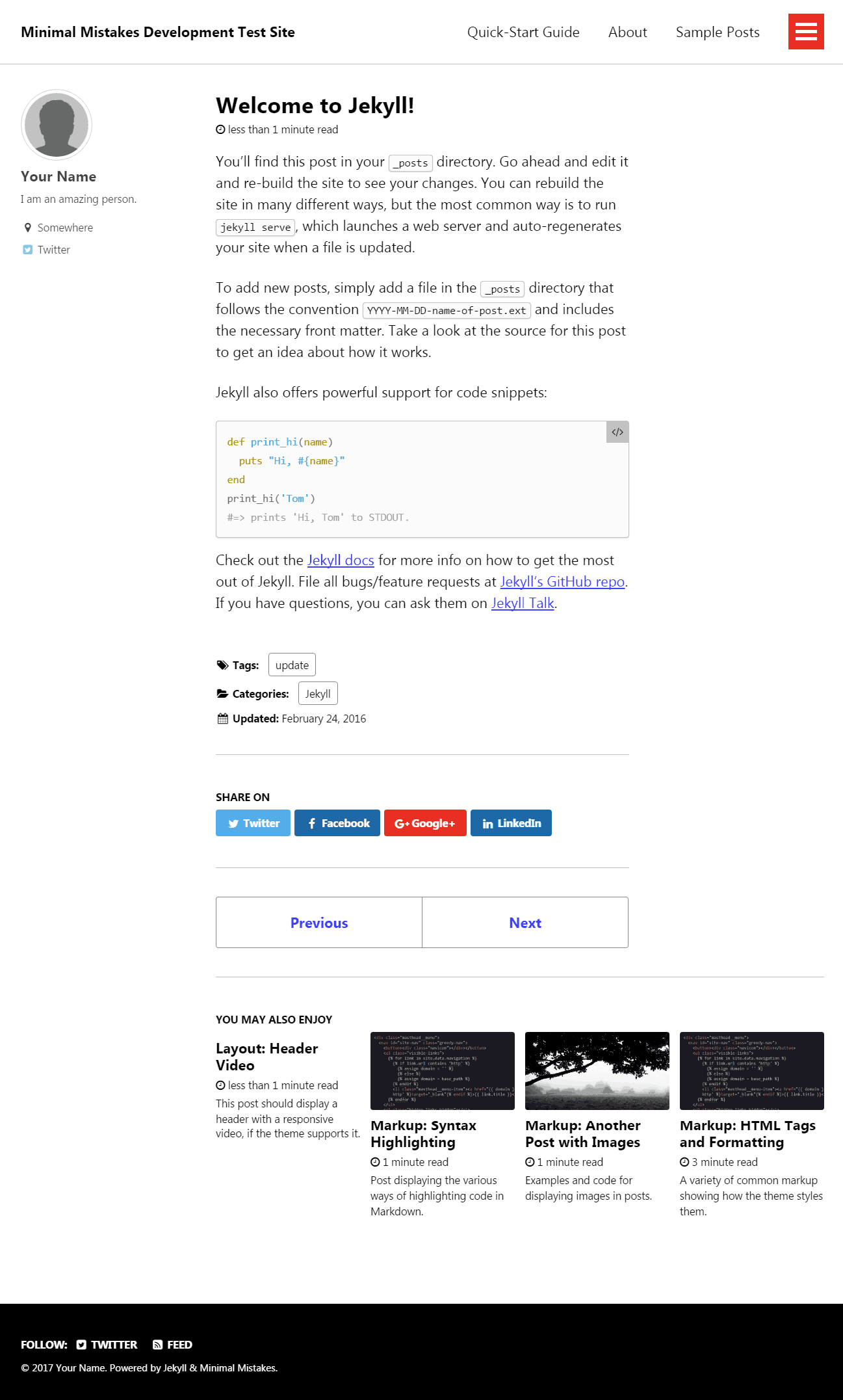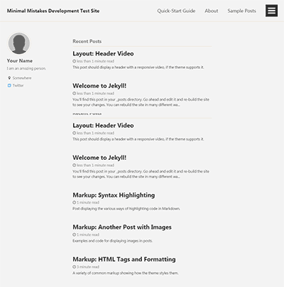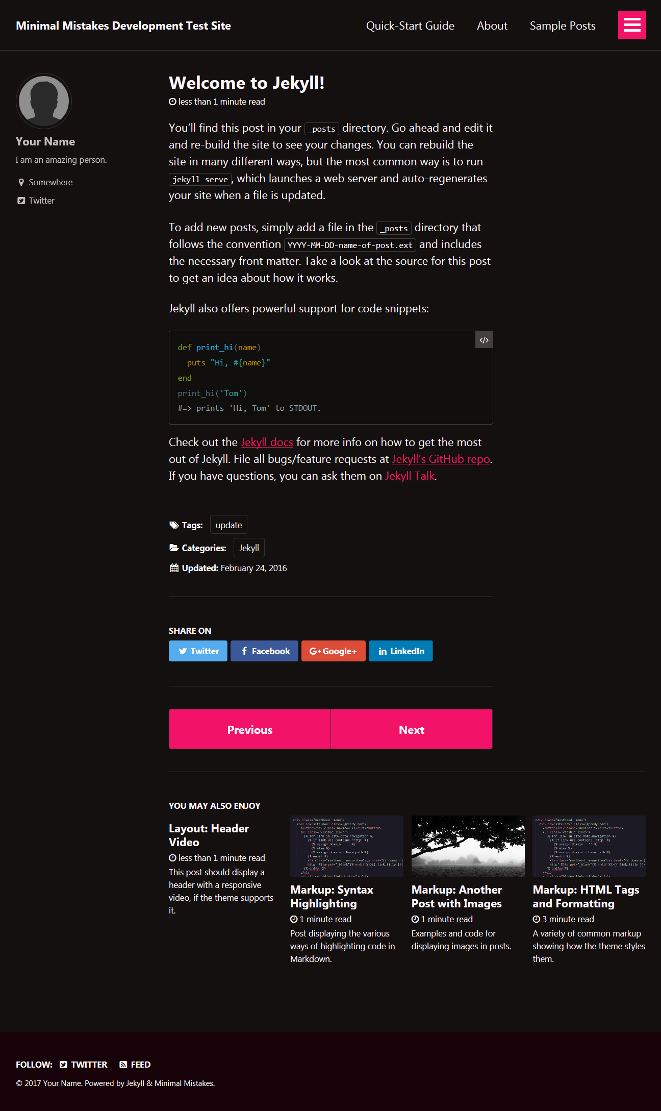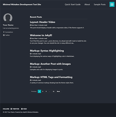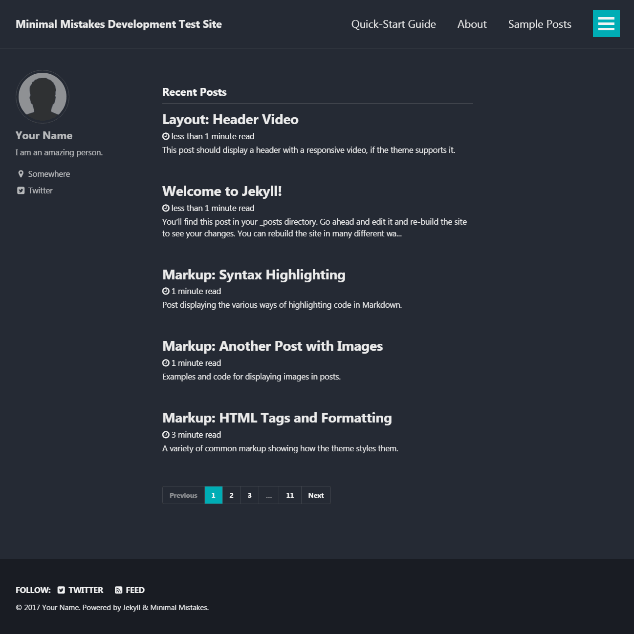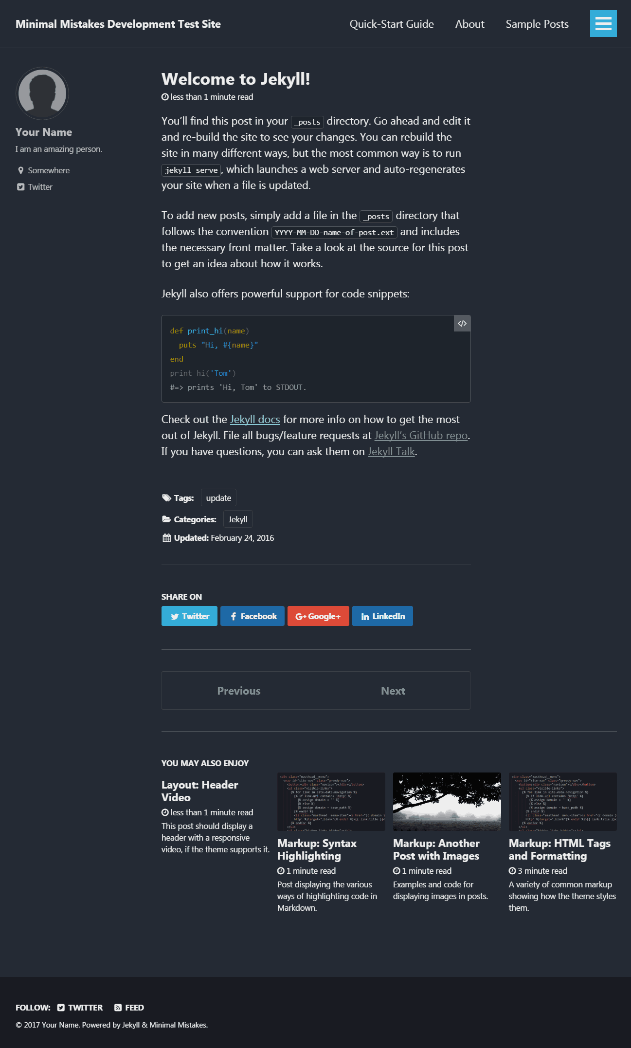 Again nothing out of the ordinary here as the theme adheres to the defaults used by GitHub Pages. Kramdown for Markdown conversion, Rouge syntax highlighting, and incremental building disabled. Change them if you need to.
