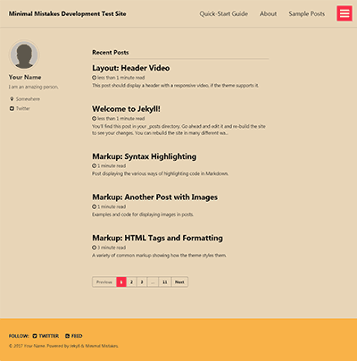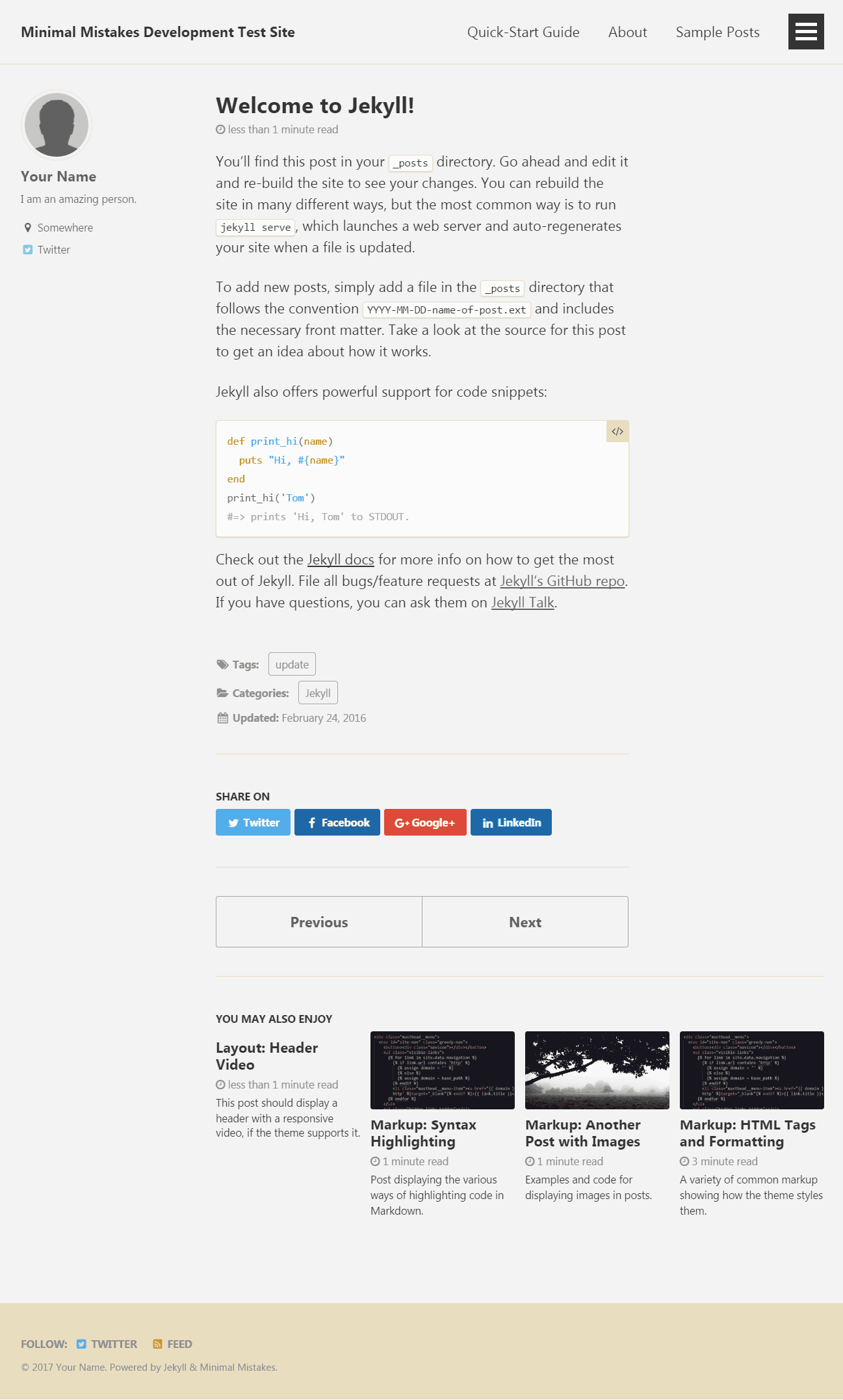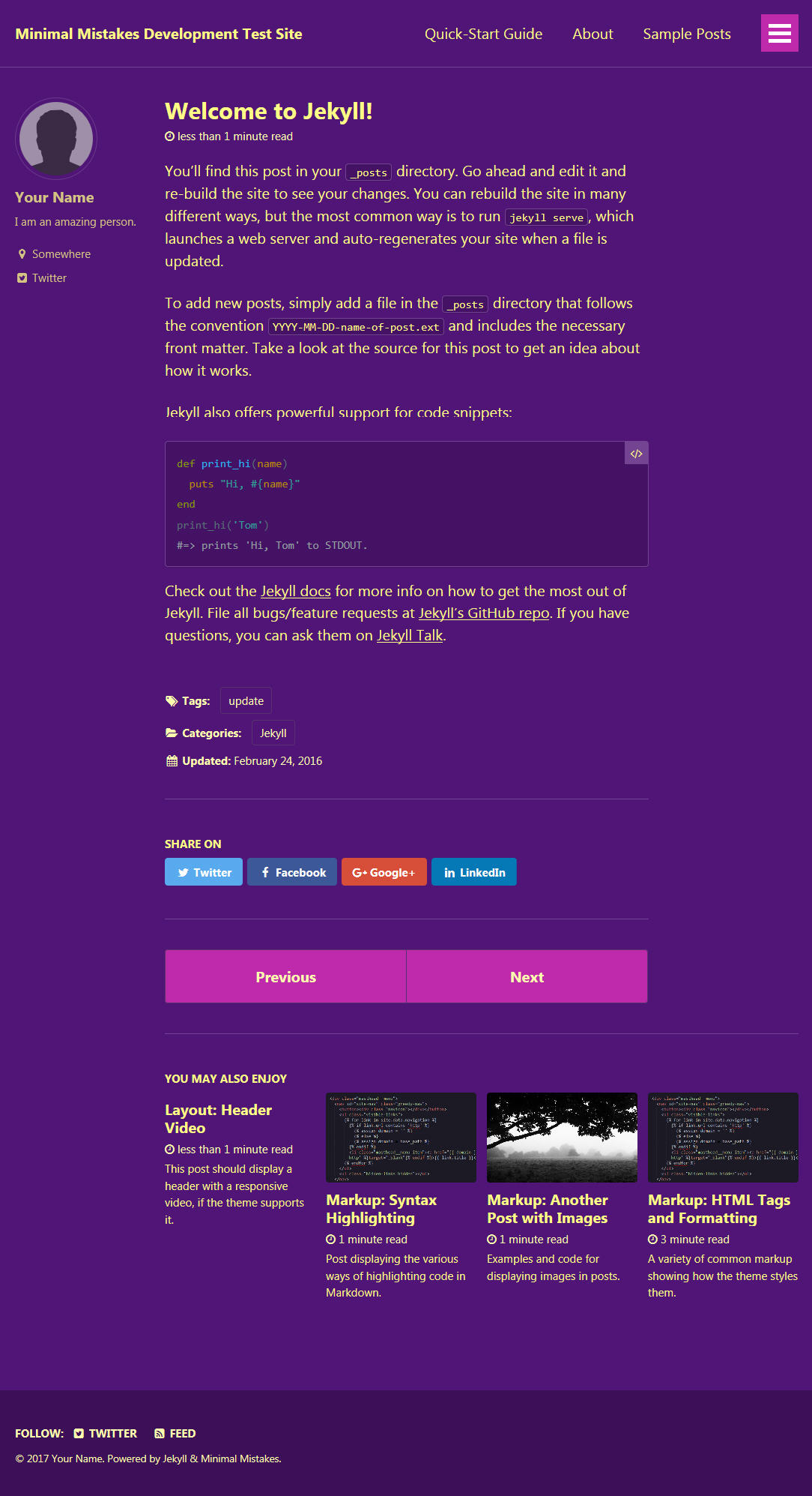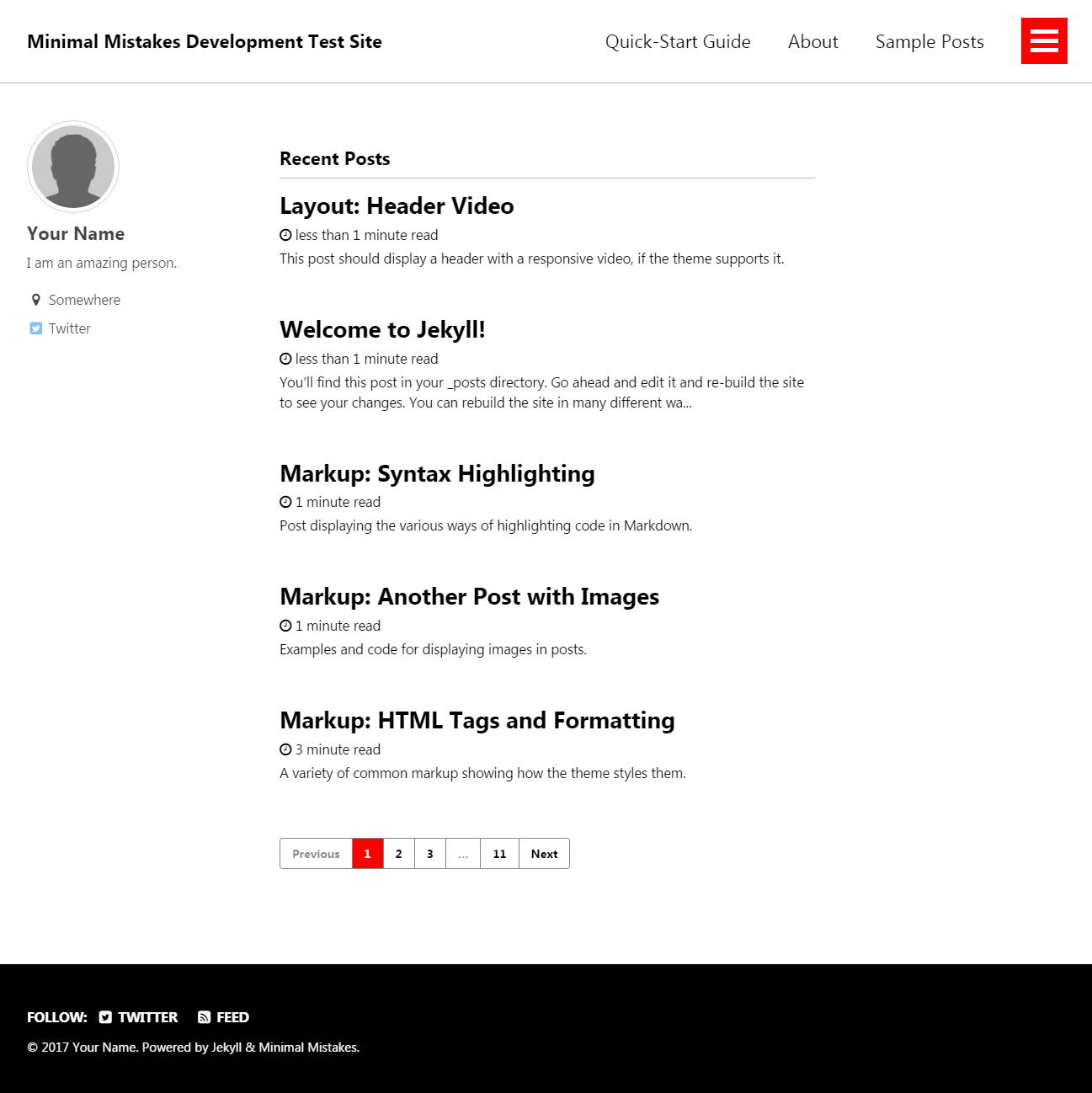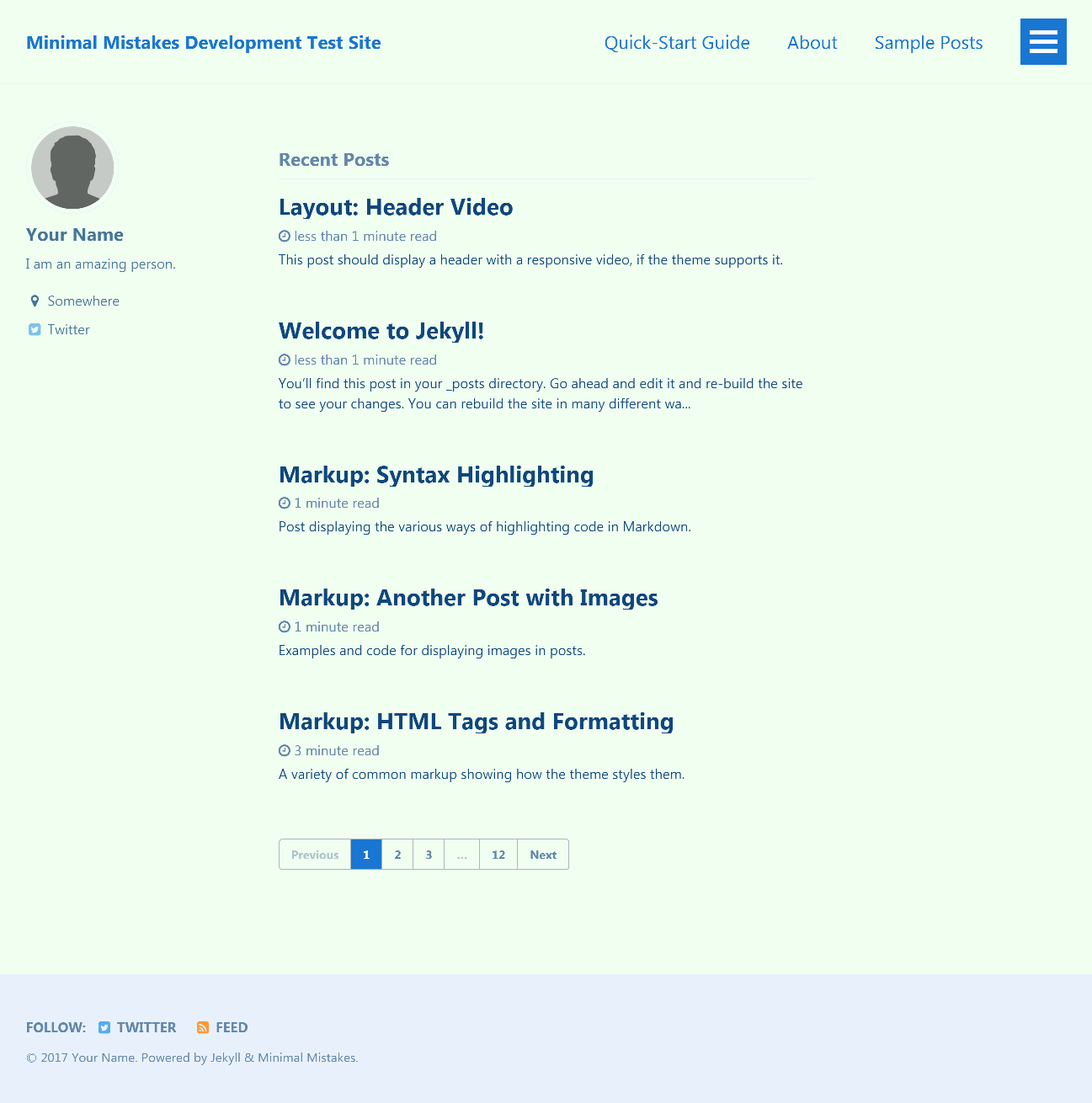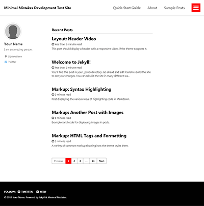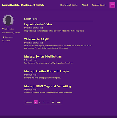 Again nothing out of the ordinary here as the theme adheres to the defaults used by GitHub Pages. Kramdown for Markdown conversion, Rouge syntax highlighting, and incremental building disabled. Change them if you need to.