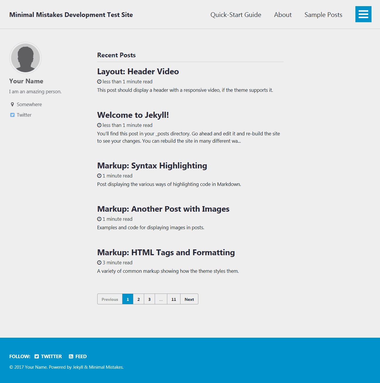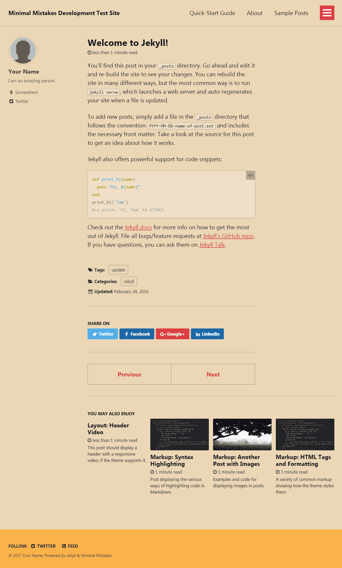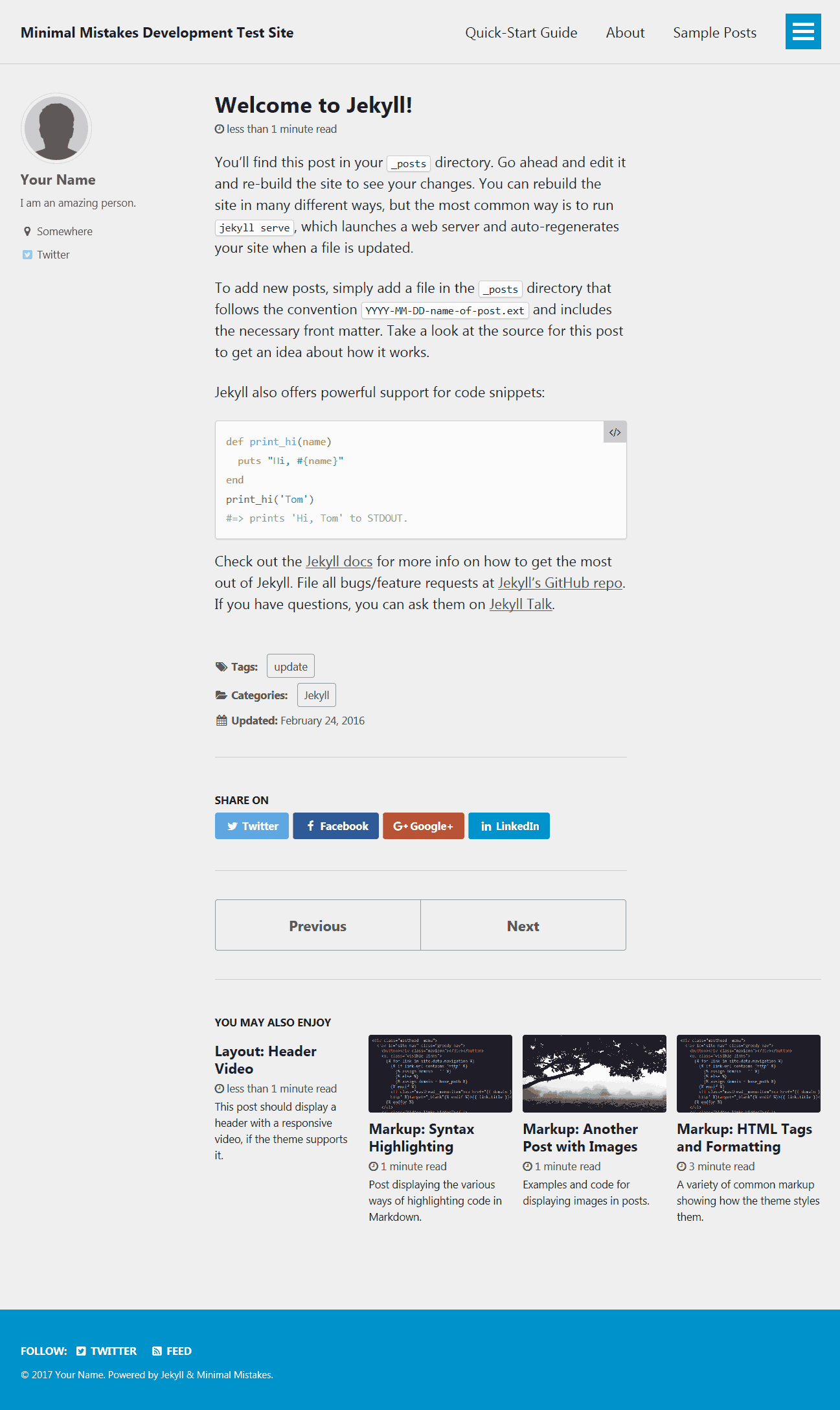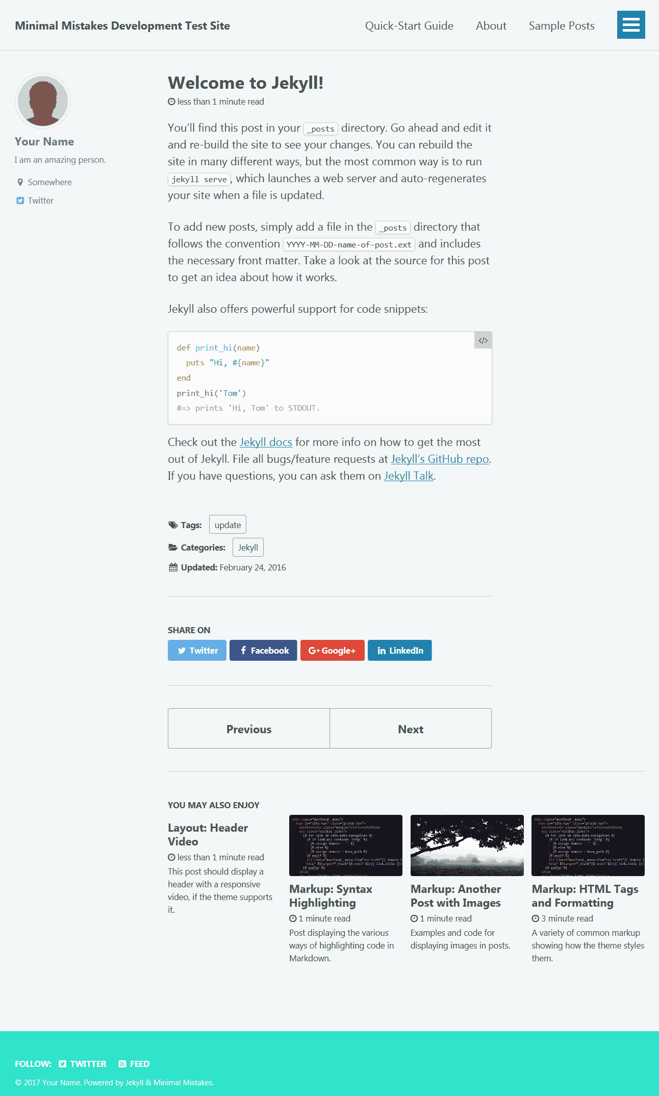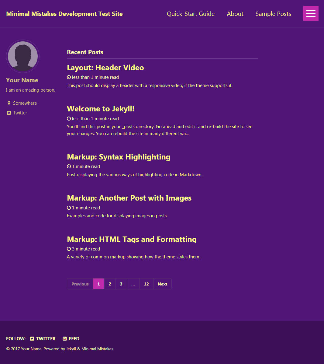 Again nothing out of the ordinary here as the theme adheres to the defaults used by GitHub Pages. Kramdown for Markdown conversion, Rouge syntax highlighting, and incremental building disabled. Change them if you need to.