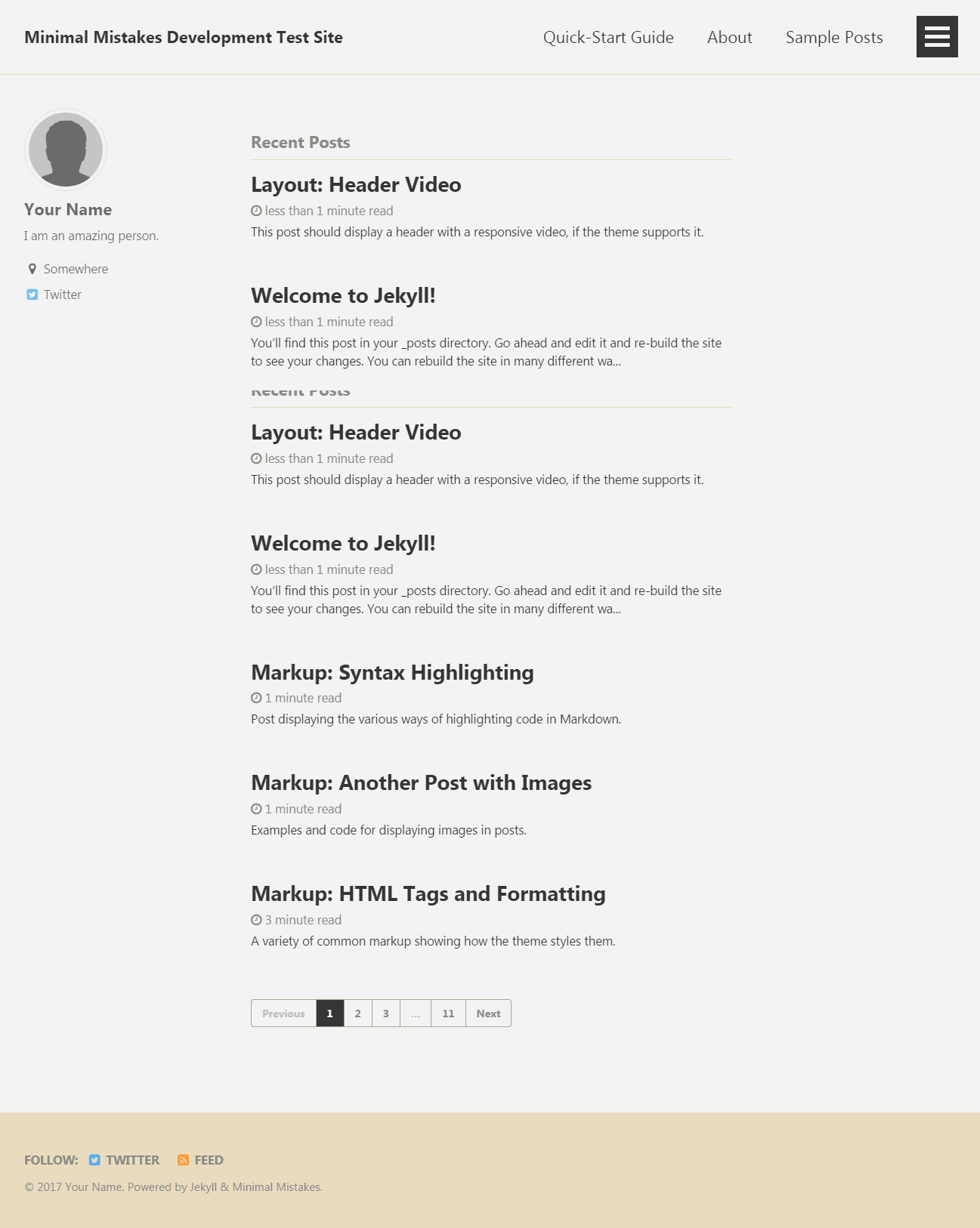 Please note: When using Jekyll’s default pagination plugin paginator.posts can only be called once. If you’re looking for something more powerful that can paginate category, tag, and collection pages I suggest jekyll-paginate-v2.
